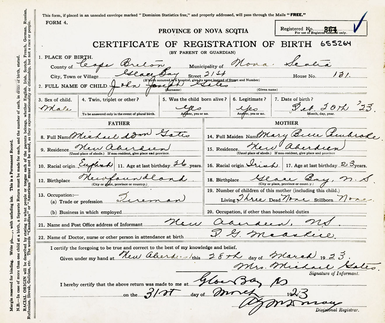 Male Birth Registration: Year: 1923 number: 65500264