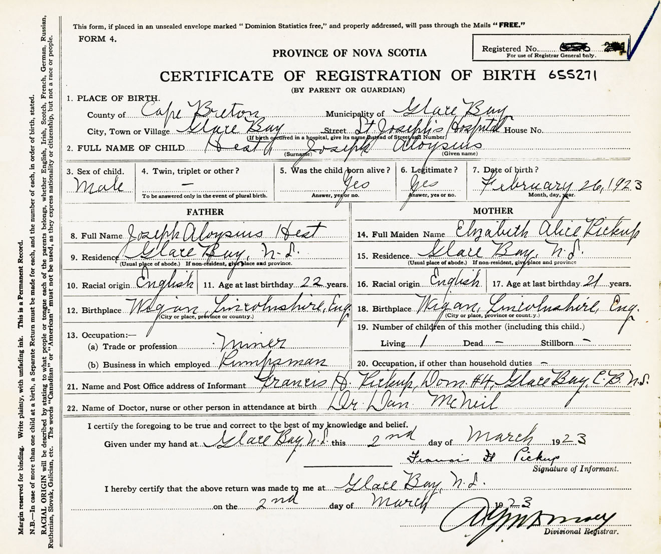 Male Birth Registration: Year: 1923 number: 65500271