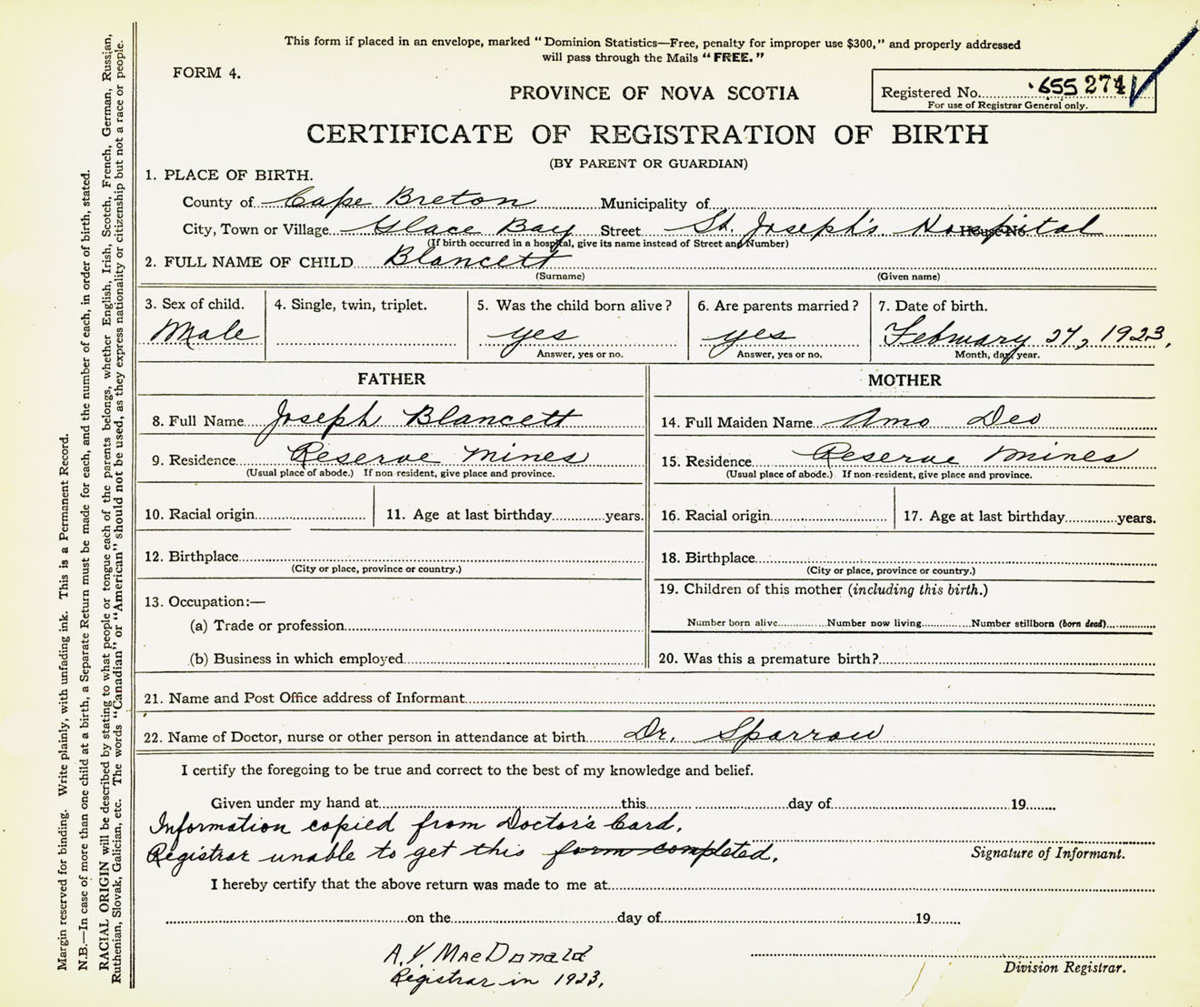 Male Birth Registration: Year: 1923 number: 65500274