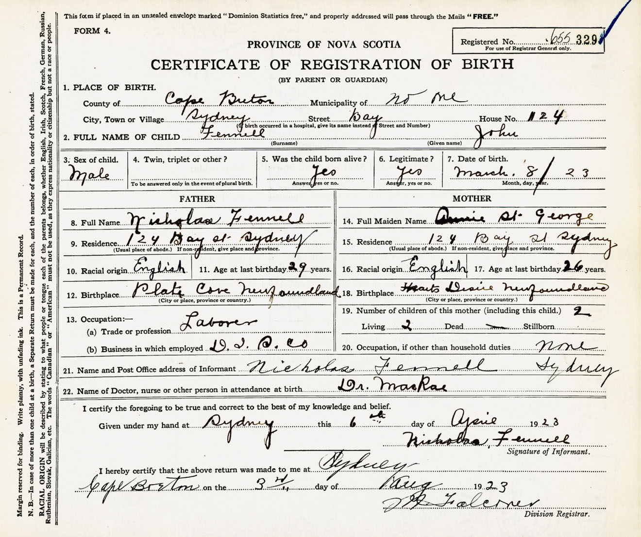 Male Birth Registration: Year: 1923 number: 65500329