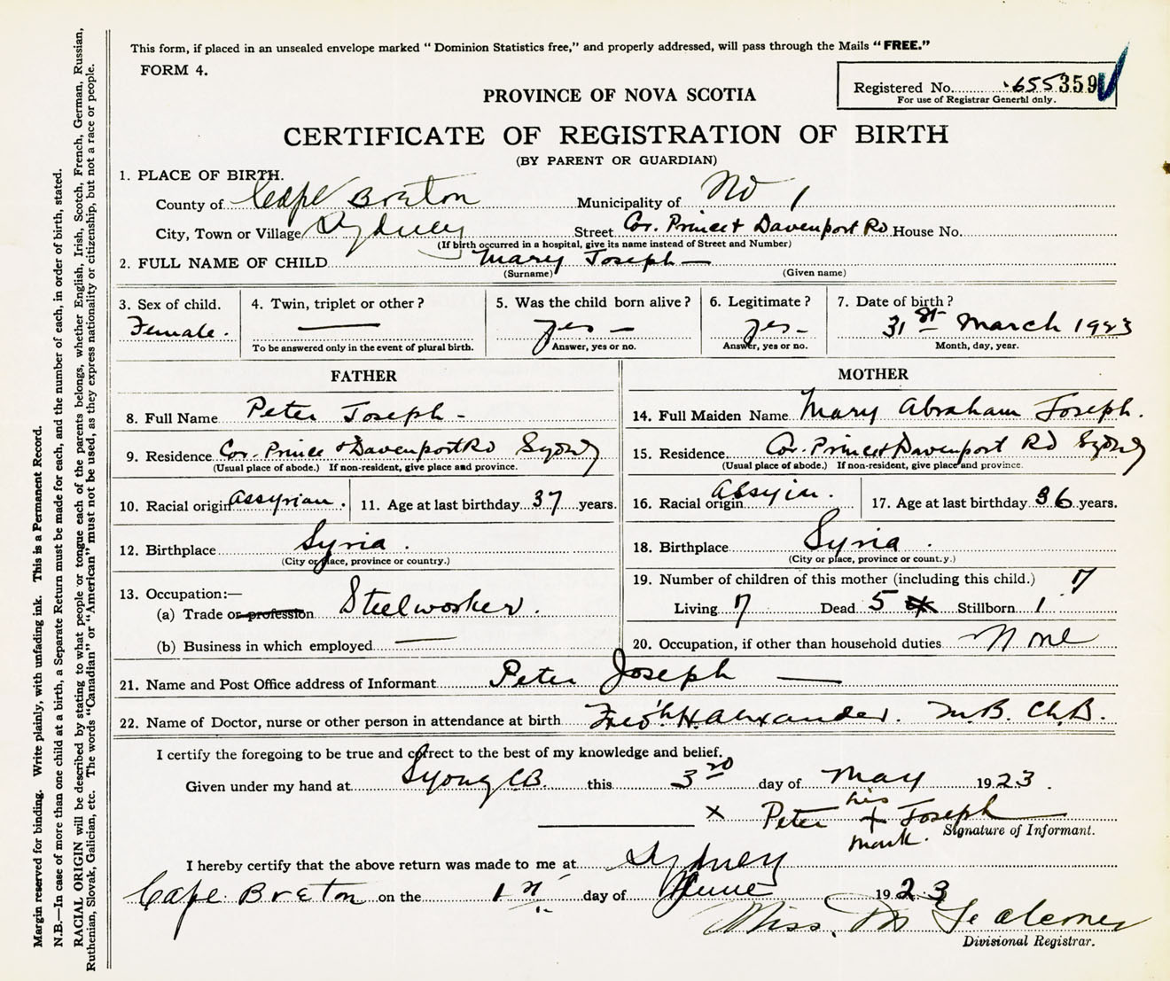 Female Birth Registration: Year: 1923 number: 65500359
