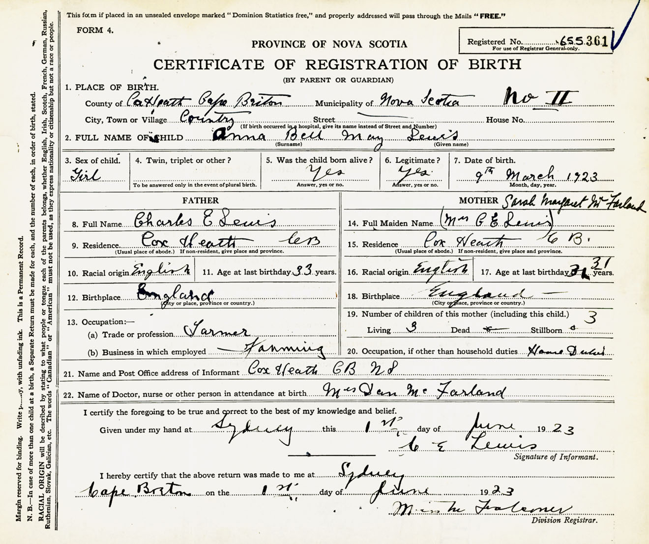 Female Birth Registration: Year: 1923 number: 65500361