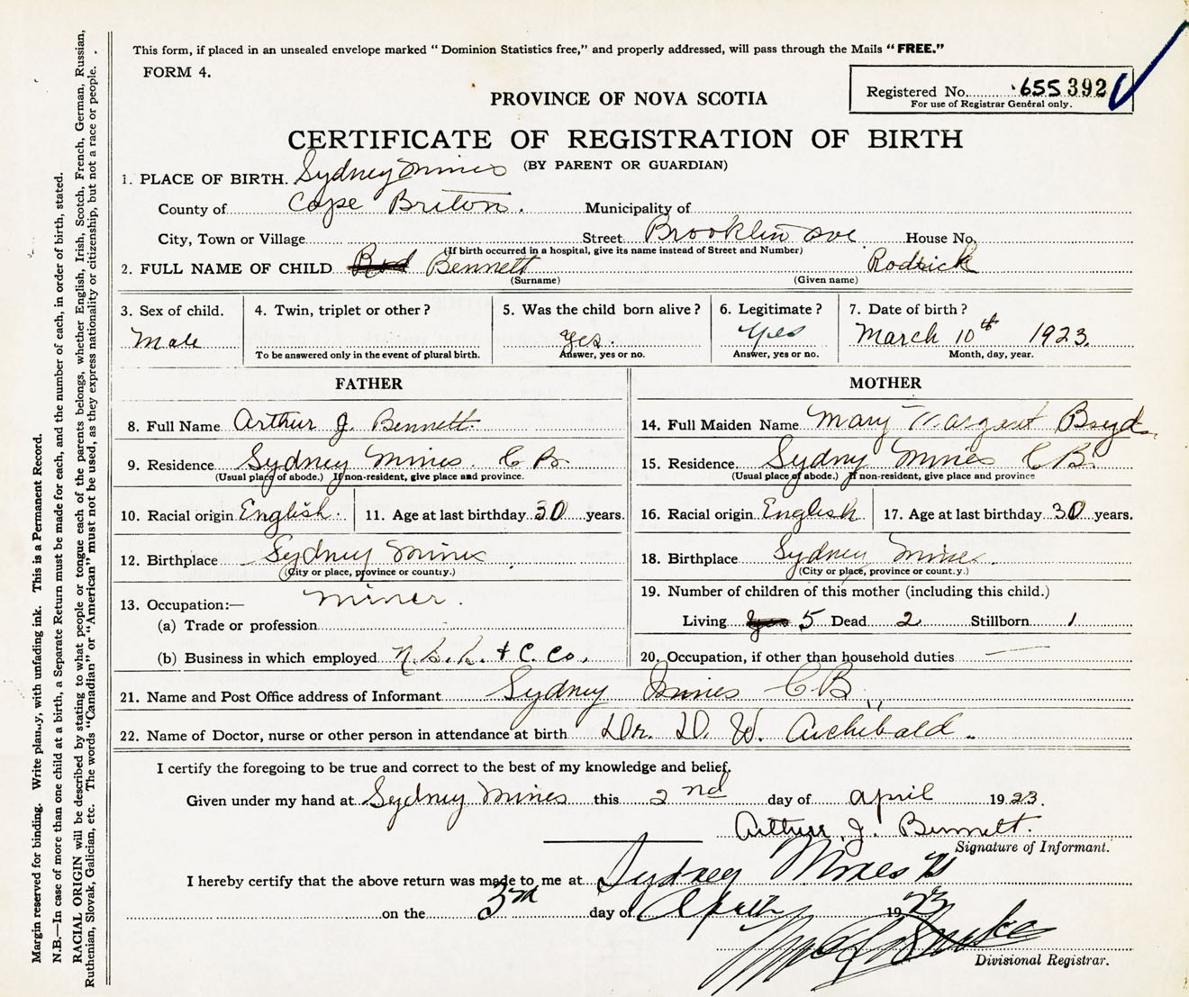 Male Birth Registration: Year: 1923 number: 65500392