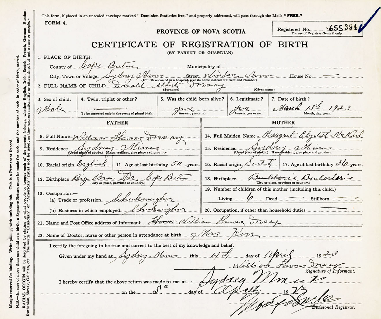 Male Birth Registration: Year: 1923 number: 65500394