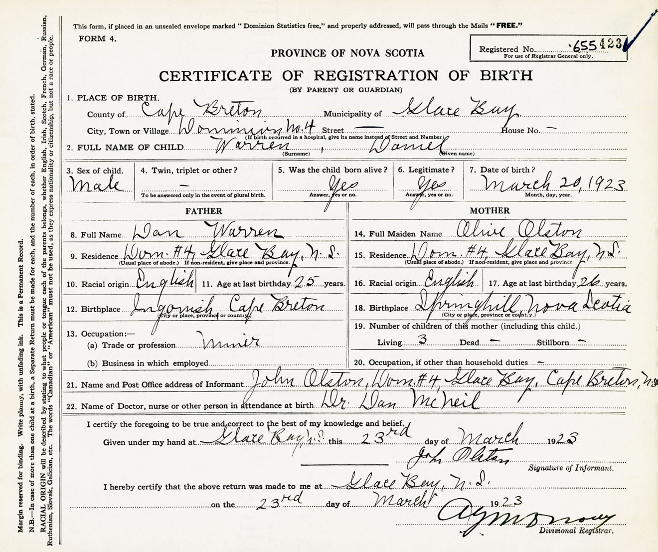 Male Birth Registration: Year: 1923 number: 65500423