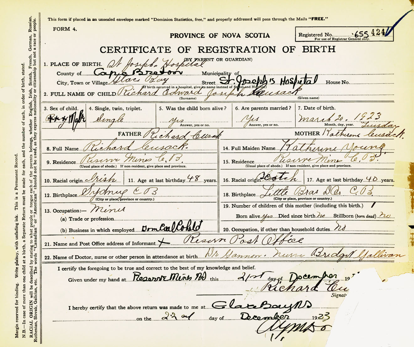 Male Birth Registration: Year: 1923 number: 65500424