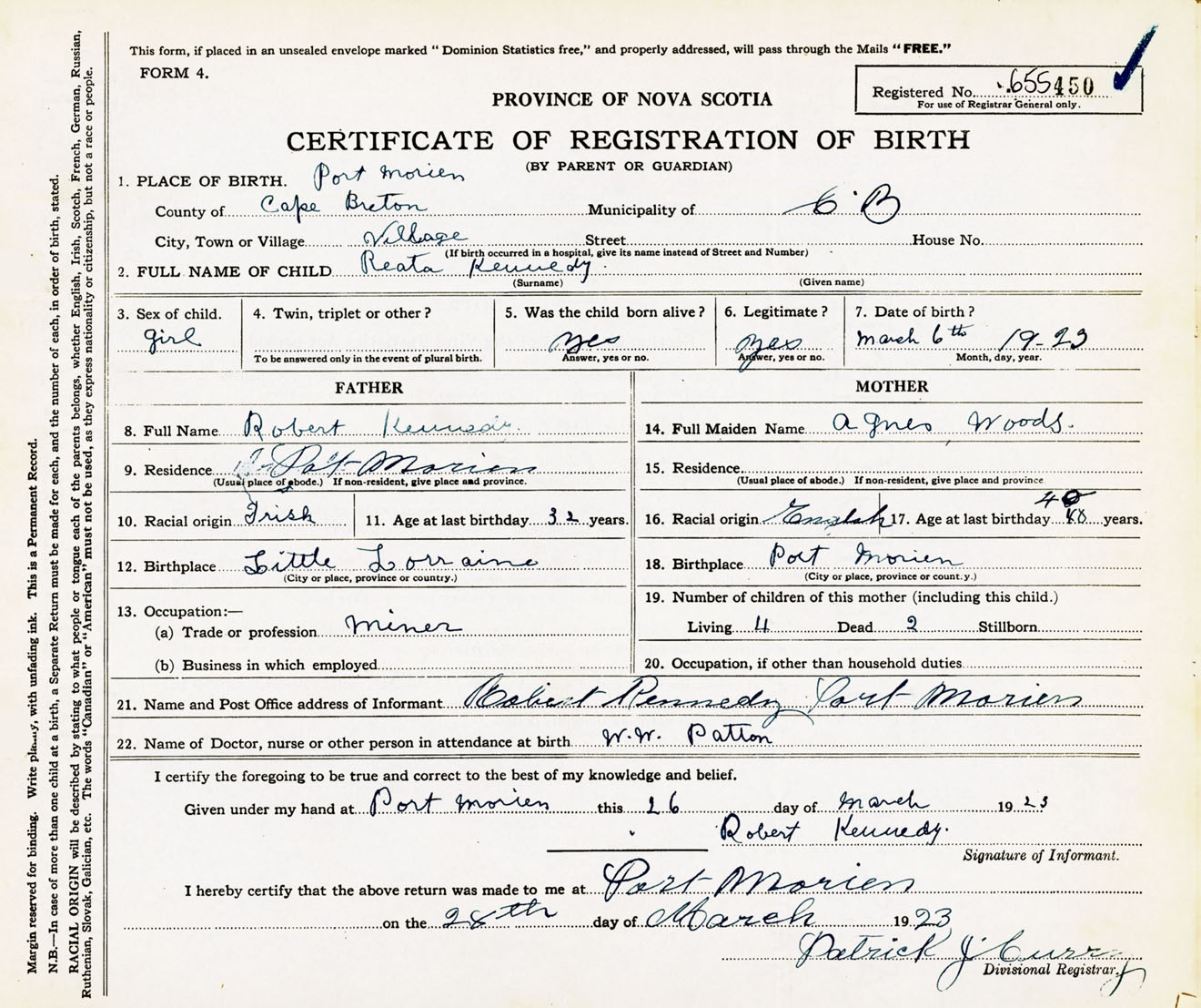 Female Birth Registration: Year: 1923 number: 65500450