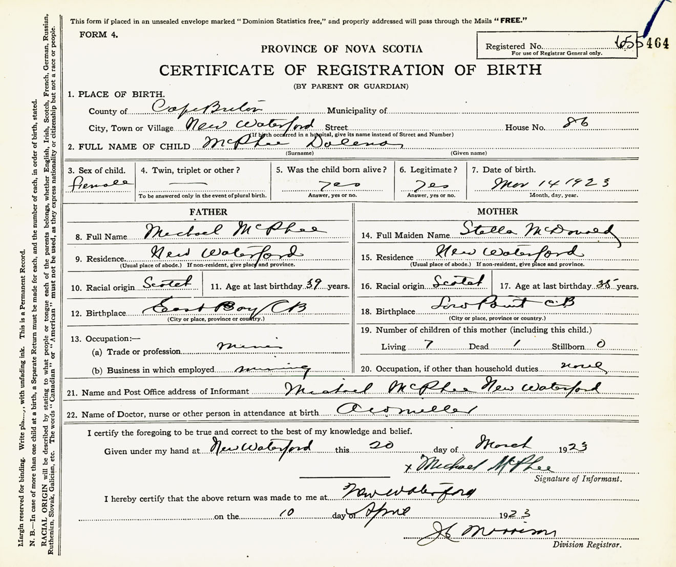 Female Birth Registration: Year: 1923 number: 65500464
