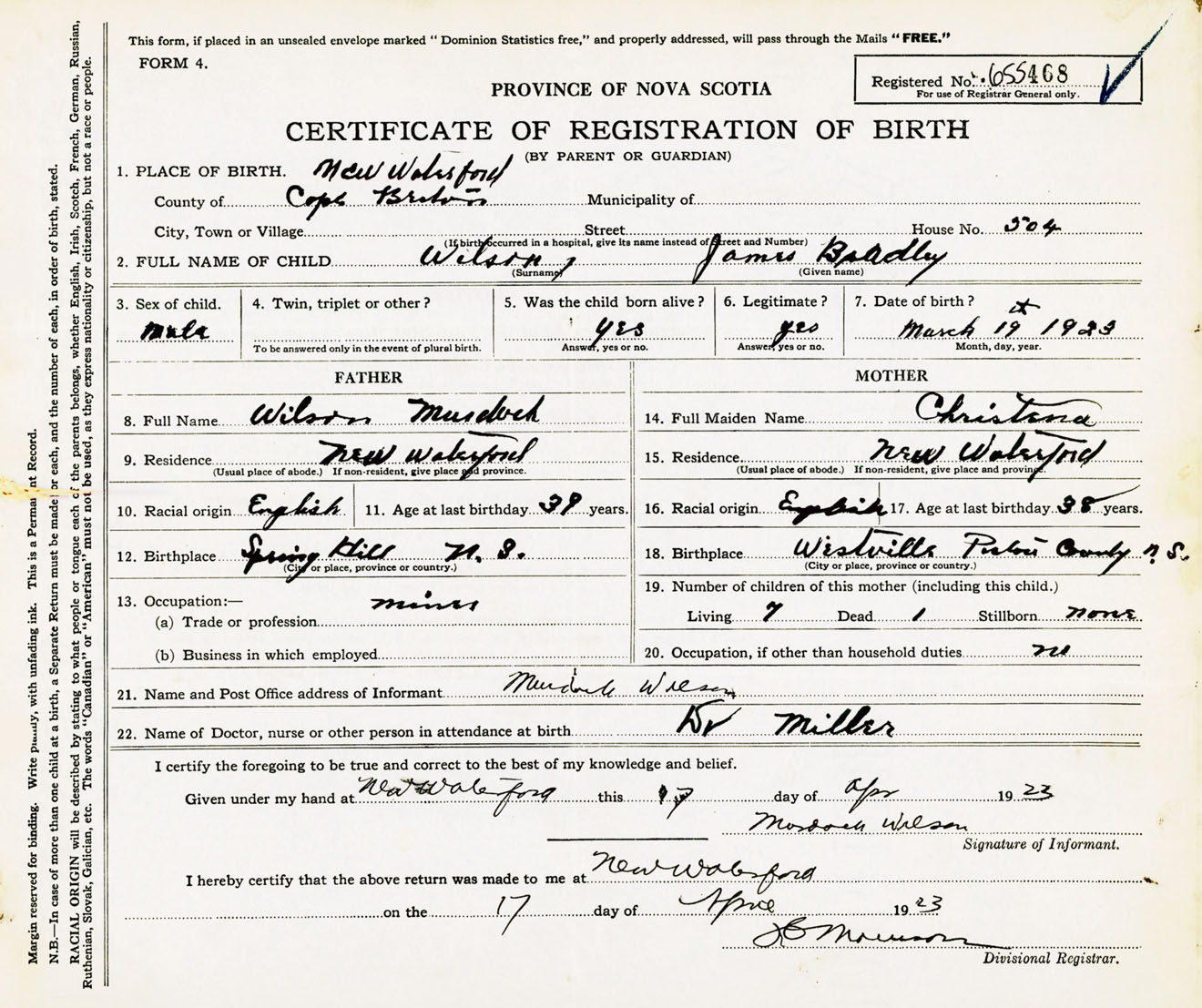 Male Birth Registration: Year: 1923 number: 65500468
