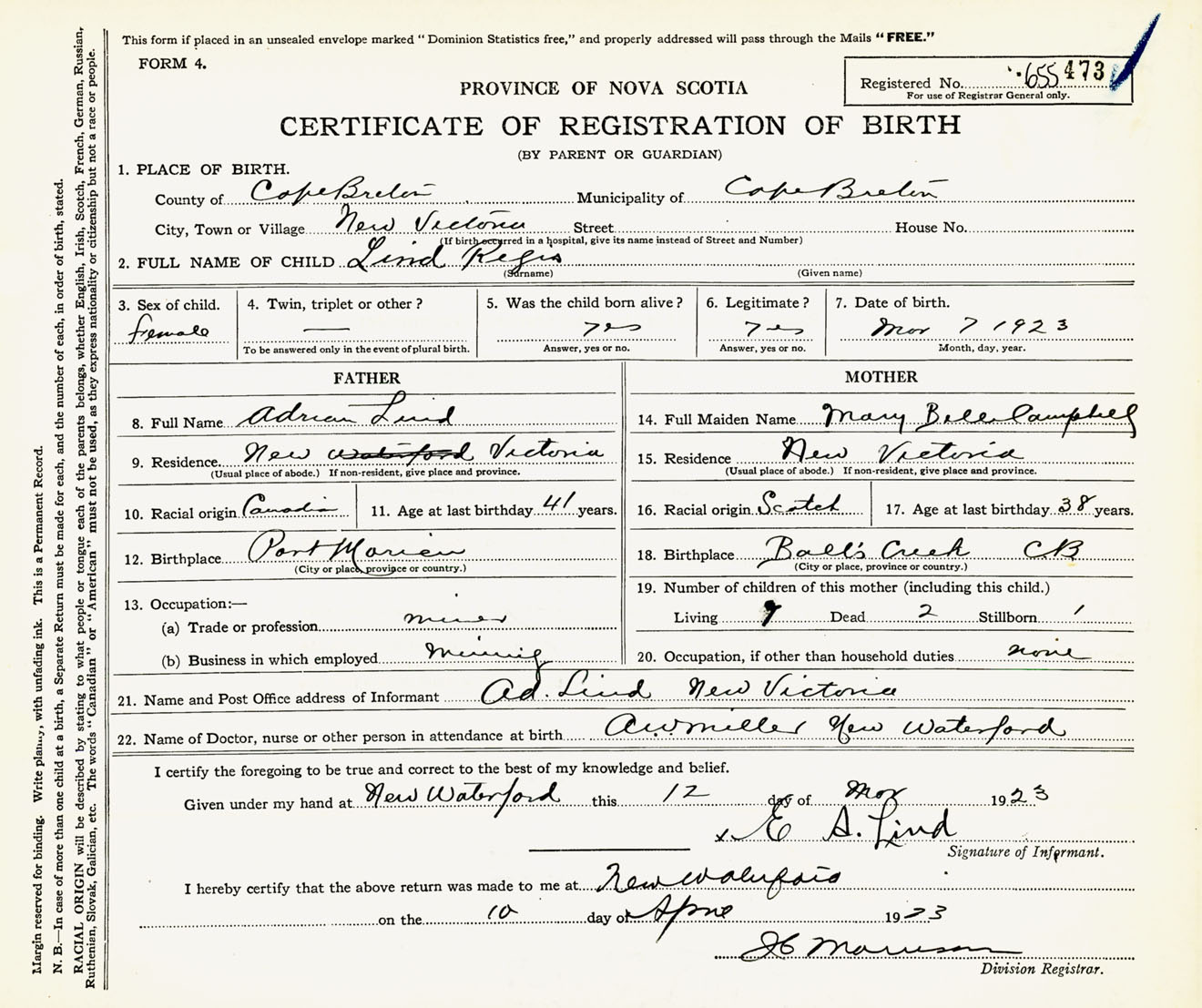 Male Birth Registration: Year: 1923 number: 65500473