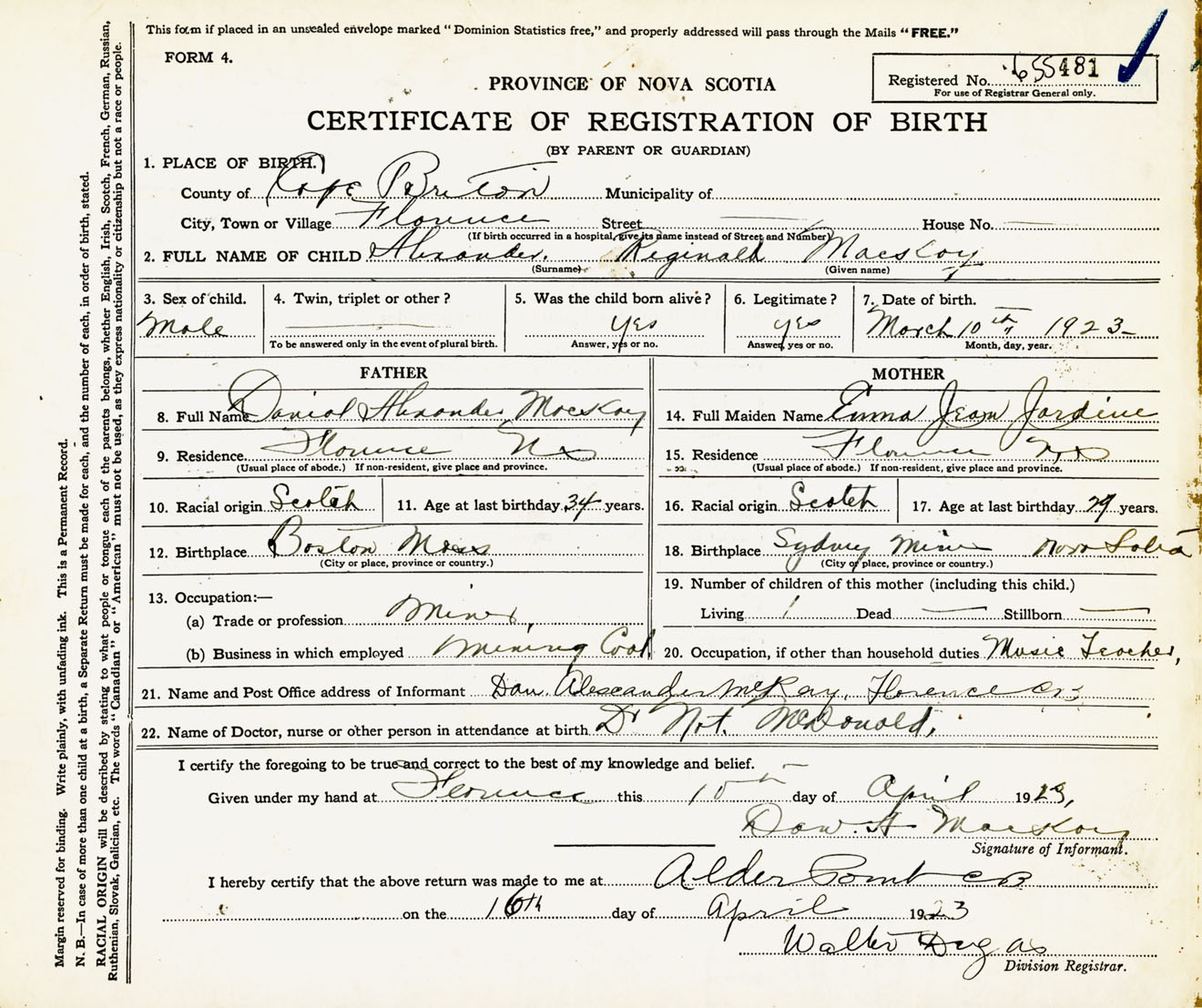 Male Birth Registration: Year: 1923 number: 65500481
