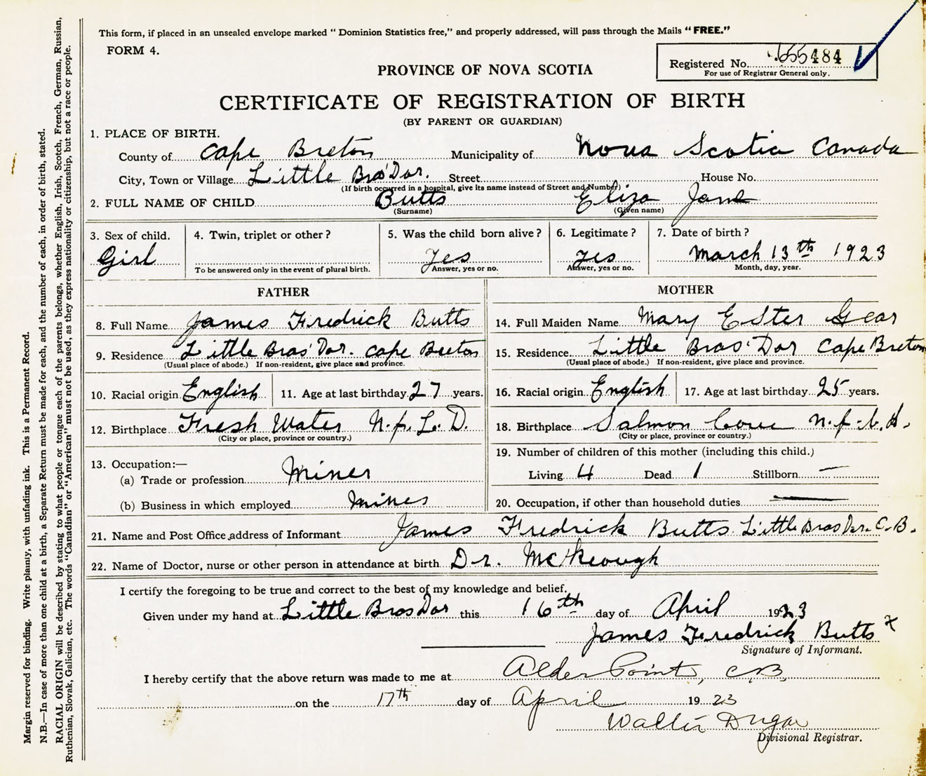Female Birth Registration: Year: 1923 number: 65500484
