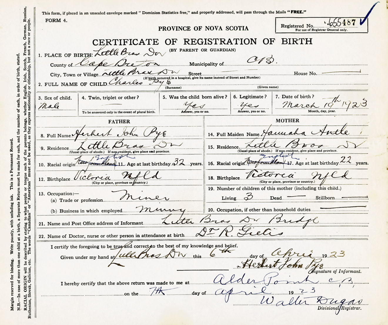 Male Birth Registration: Year: 1923 number: 65500487