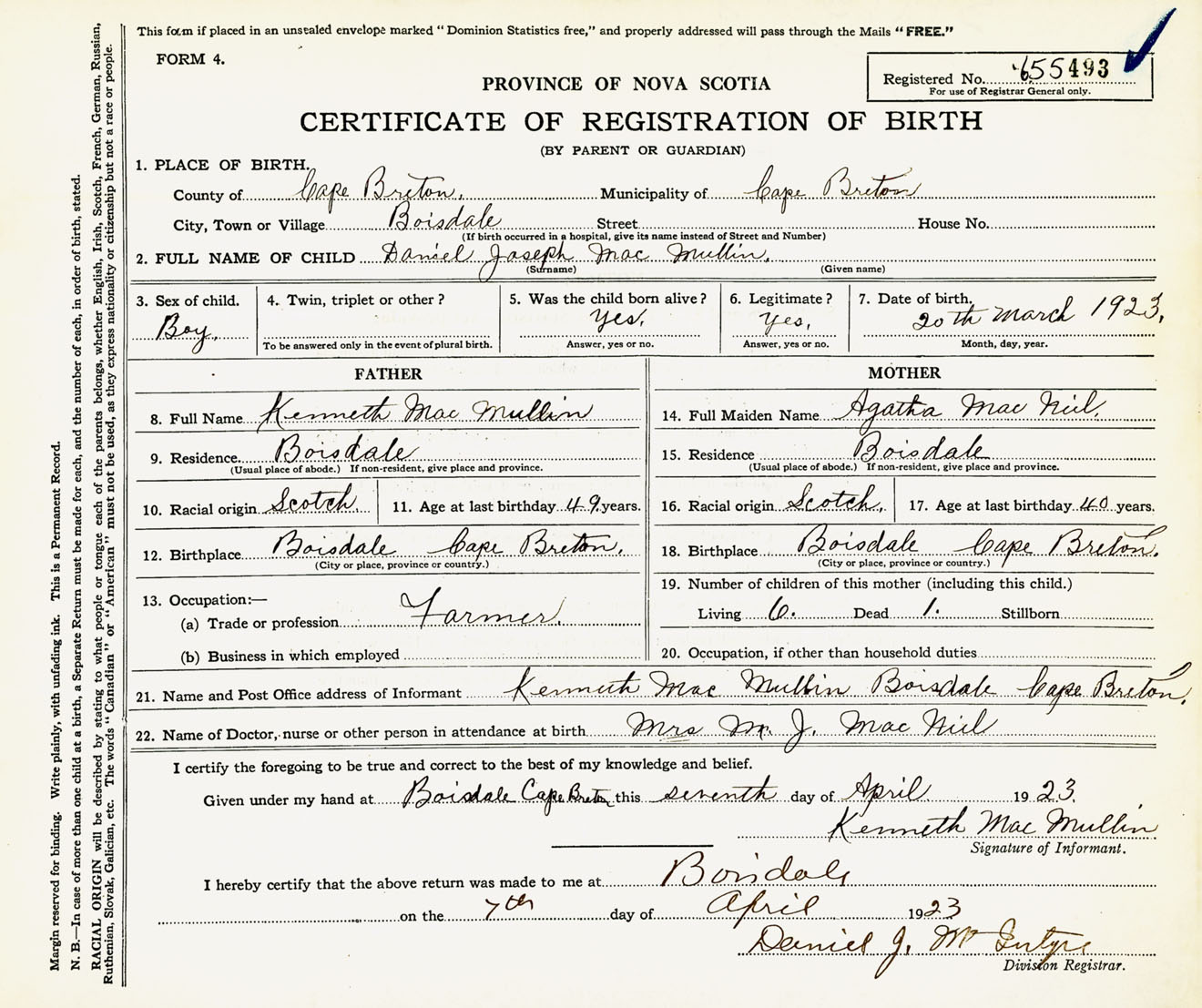 Male Birth Registration: Year: 1923 number: 65500493