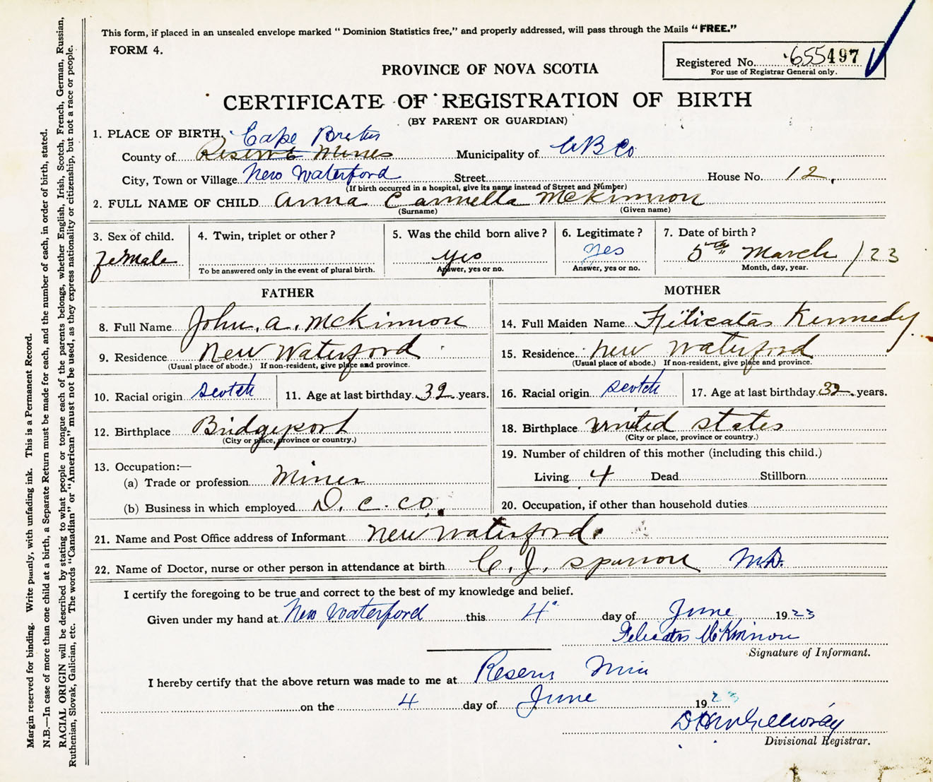 Female Birth Registration: Year: 1923 number: 65500497