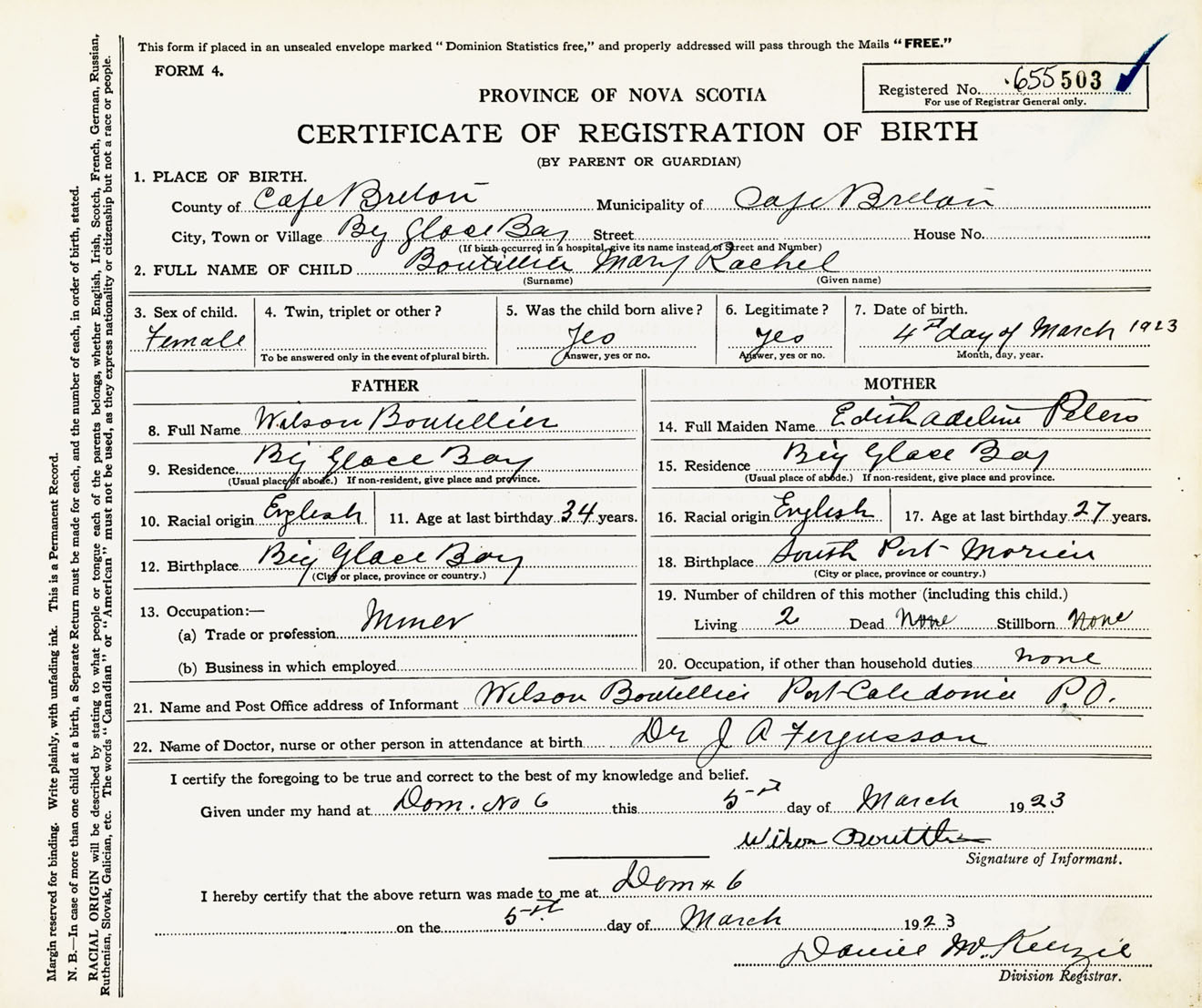 Female Birth Registration: Year: 1923 number: 65500503