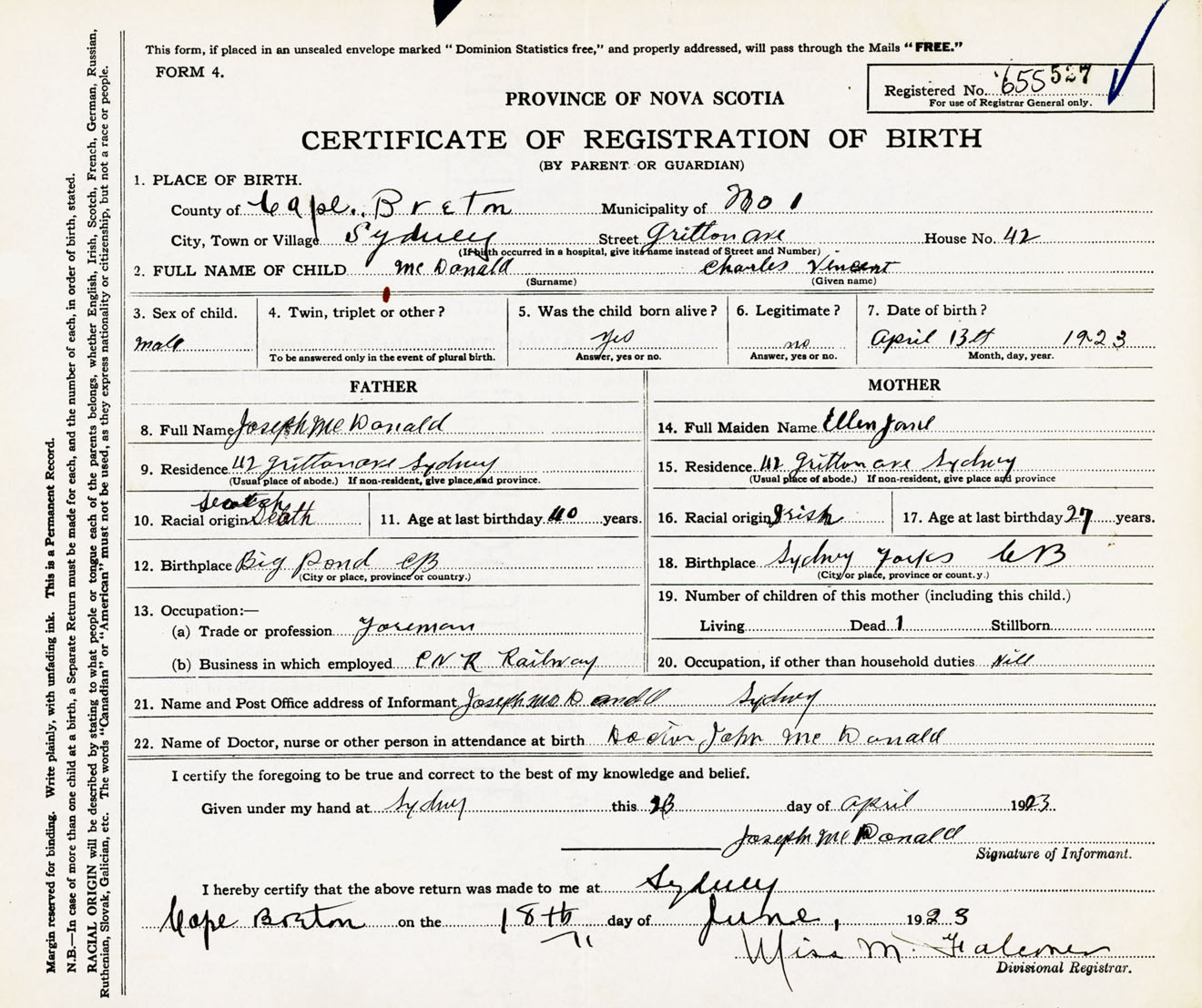 Male Birth Registration: Year: 1923 number: 65500527