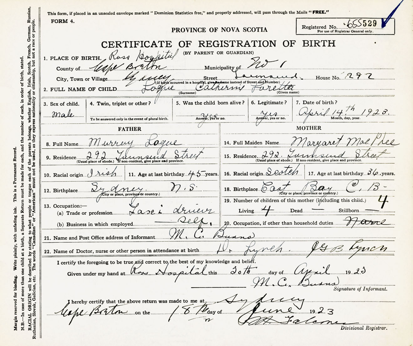 Male Birth Registration: Year: 1923 number: 65500529