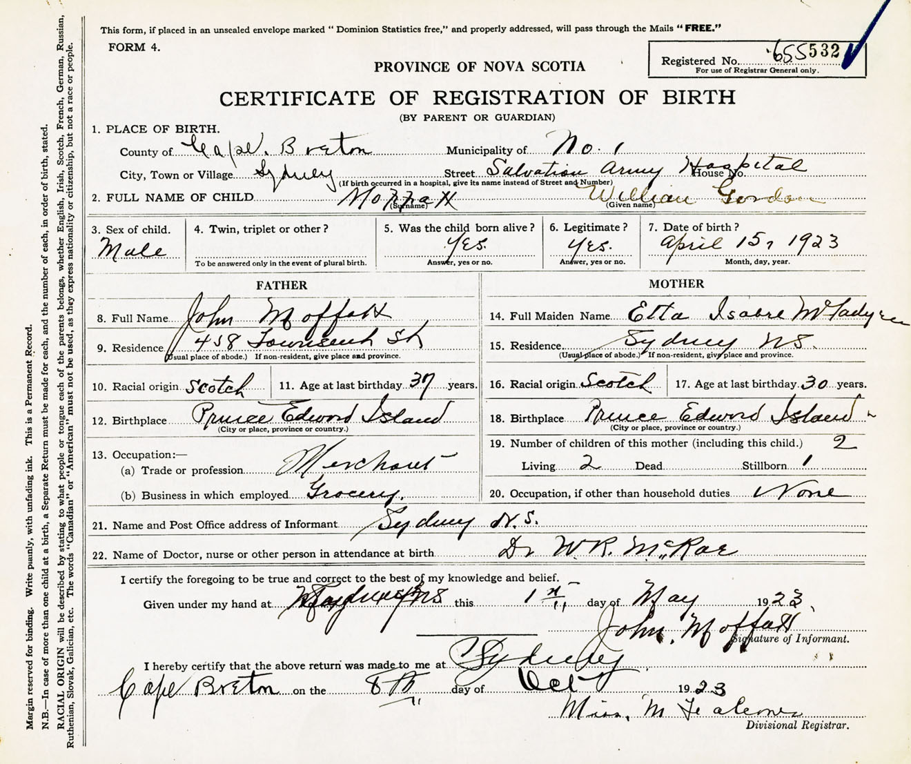 Male Birth Registration: Year: 1923 number: 65500532
