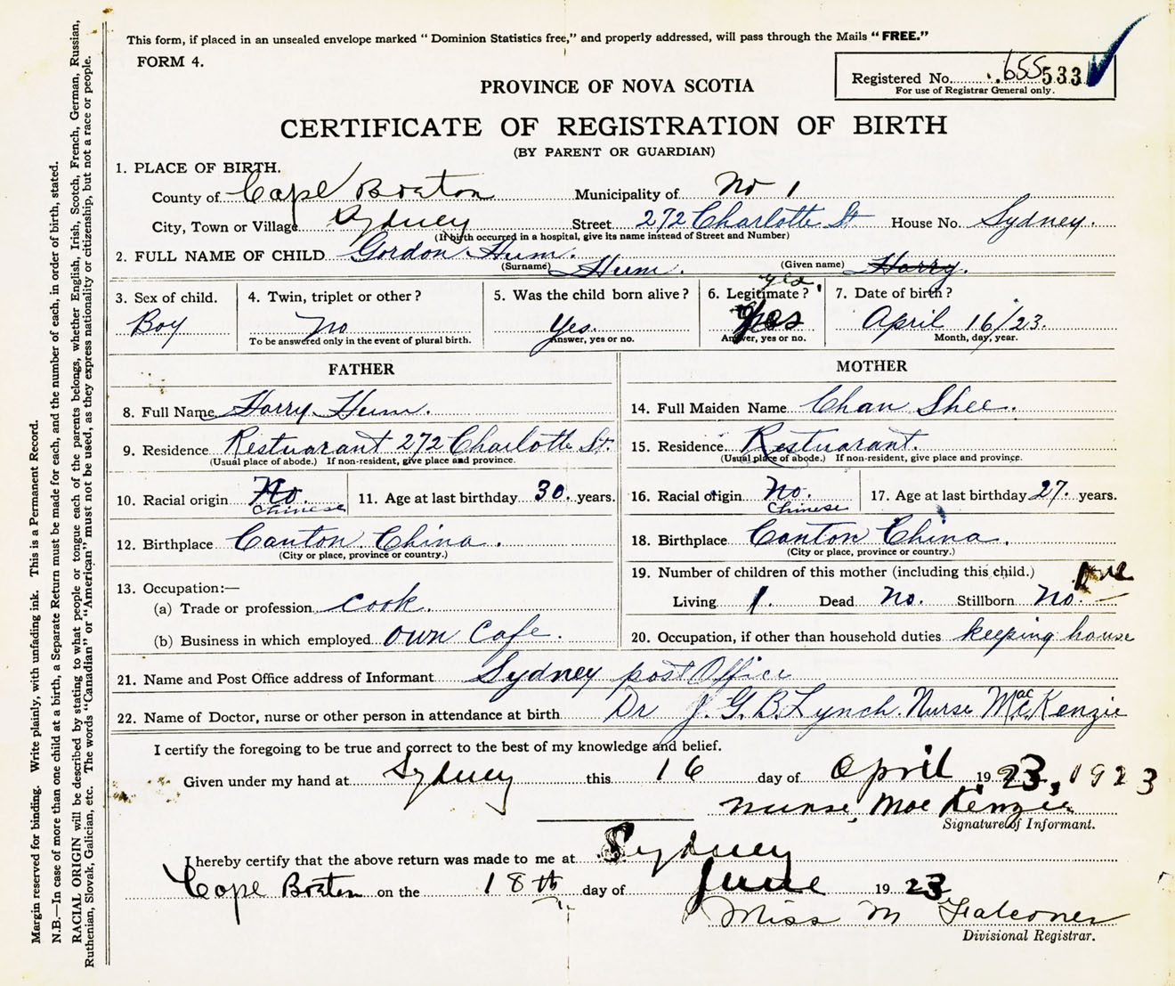 Male Birth Registration: Year: 1923 number: 65500533