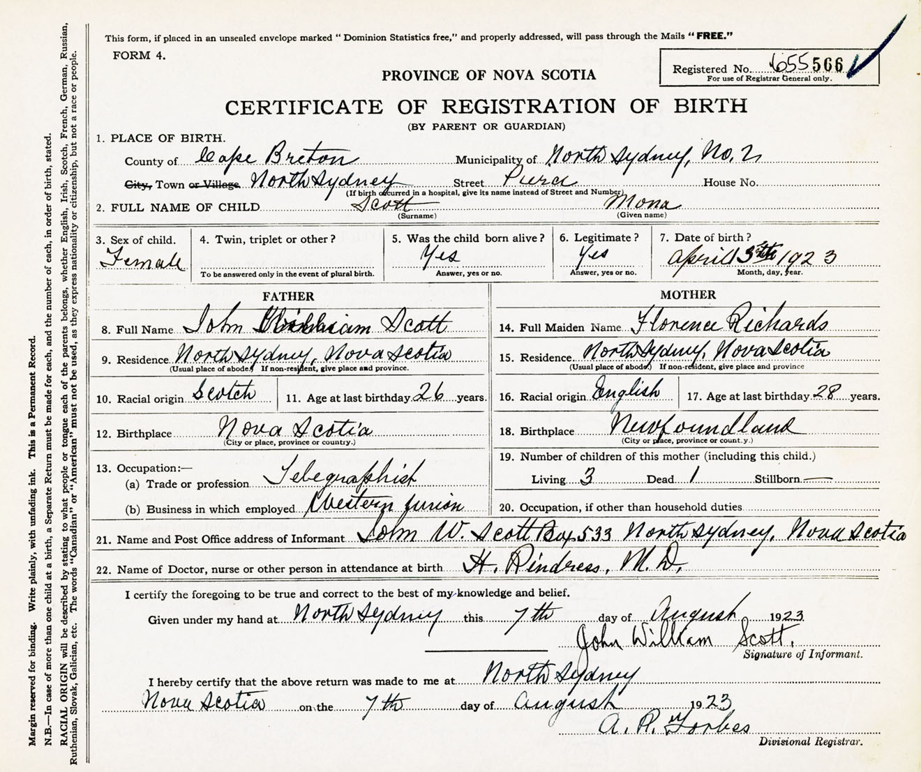 Female Birth Registration: Year: 1923 number: 65500566