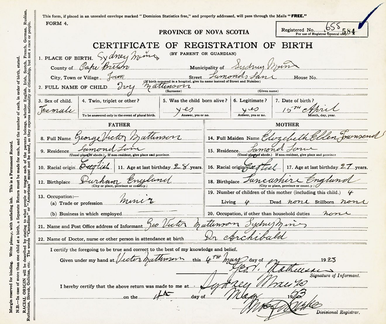 Female Birth Registration: Year: 1923 number: 65500584