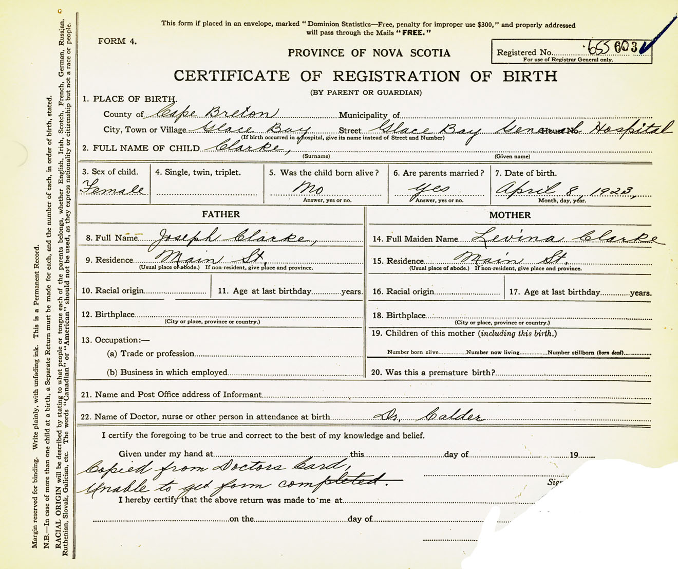 Female Birth Registration: Year: 1923 number: 65500603