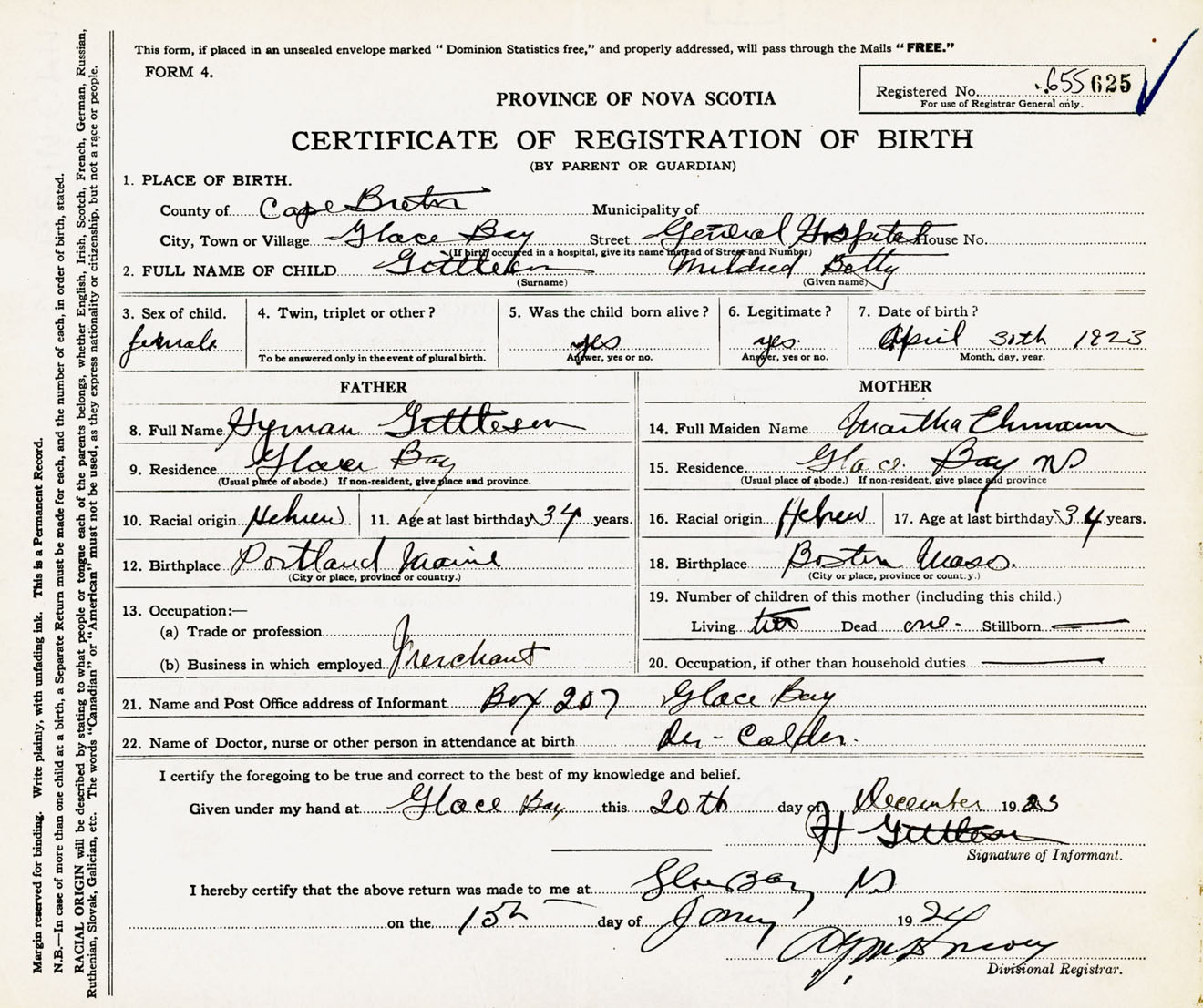 Female Birth Registration: Year: 1923 number: 65500625