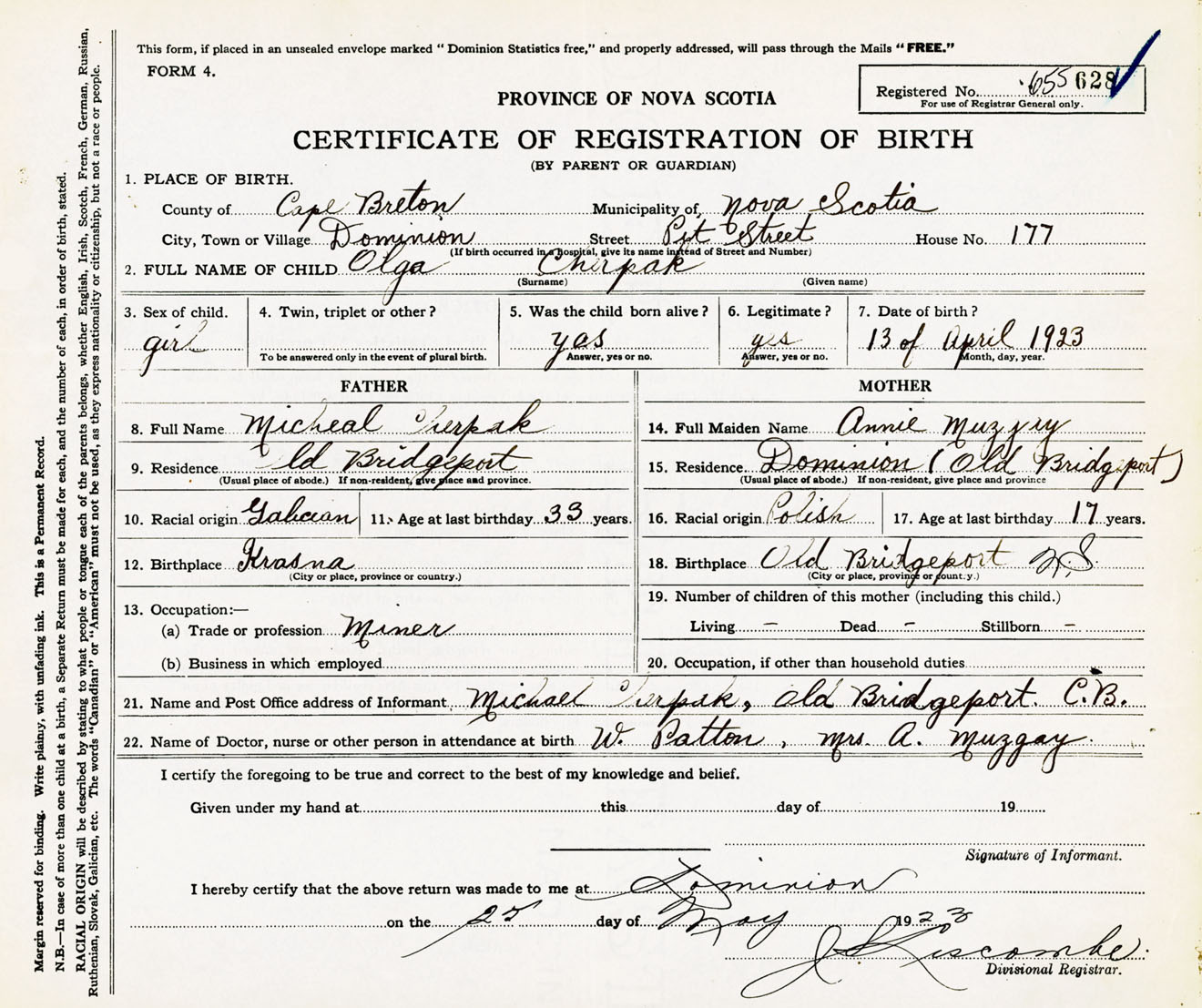 Female Birth Registration: Year: 1923 number: 65500628