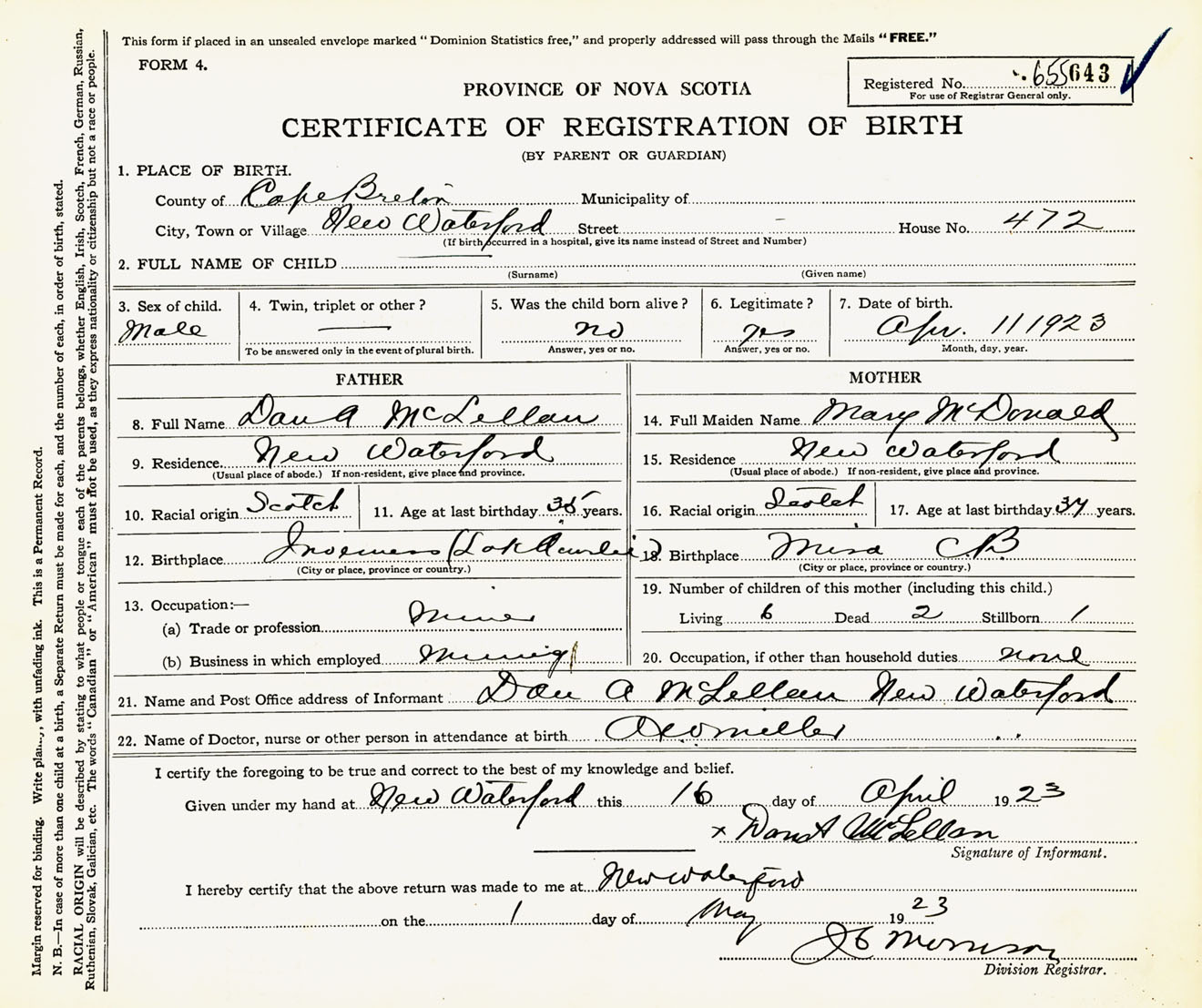 Male Birth Registration: Year: 1923 number: 65500643
