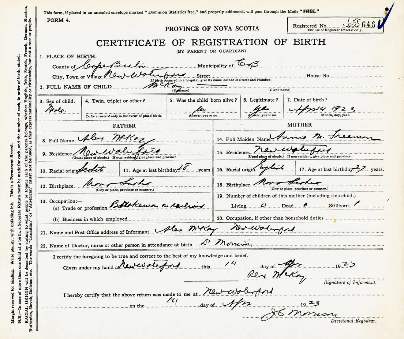 Male Birth Registration: Year: 1923 number: 65500646