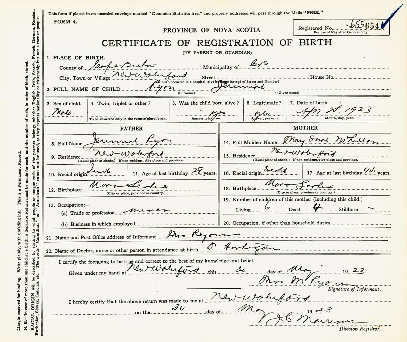 Male Birth Registration: Year: 1923 number: 65500654