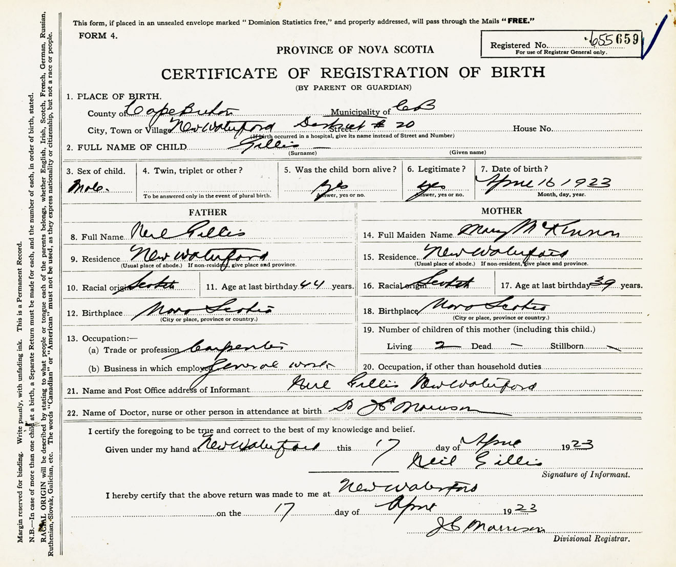 Male Birth Registration: Year: 1923 number: 65500659