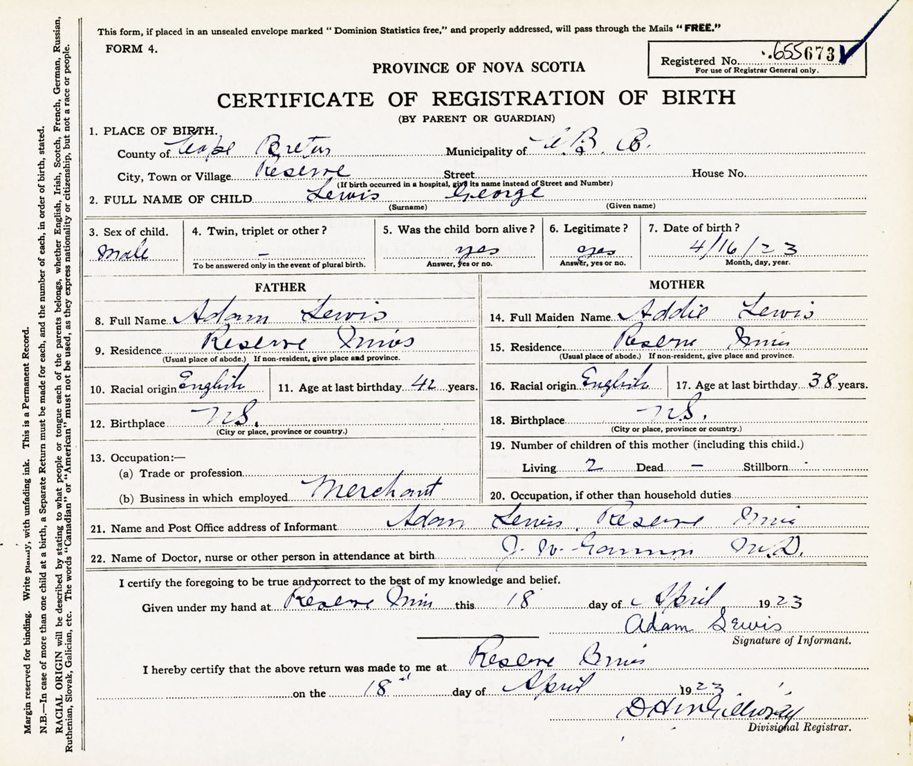Male Birth Registration: Year: 1923 number: 65500673