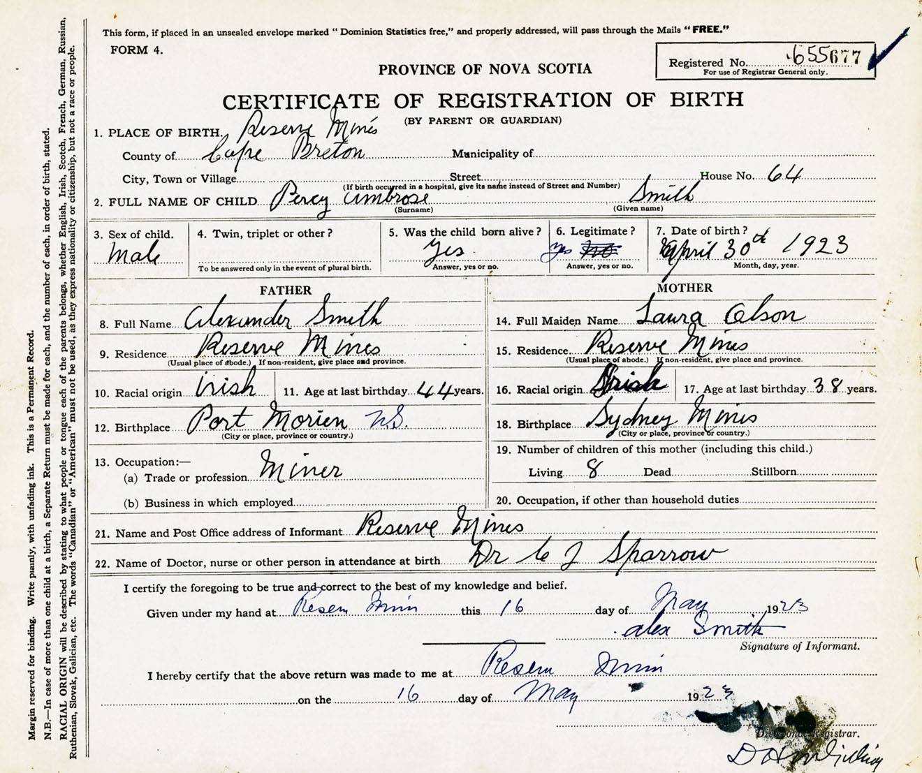 Male Birth Registration: Year: 1923 number: 65500677