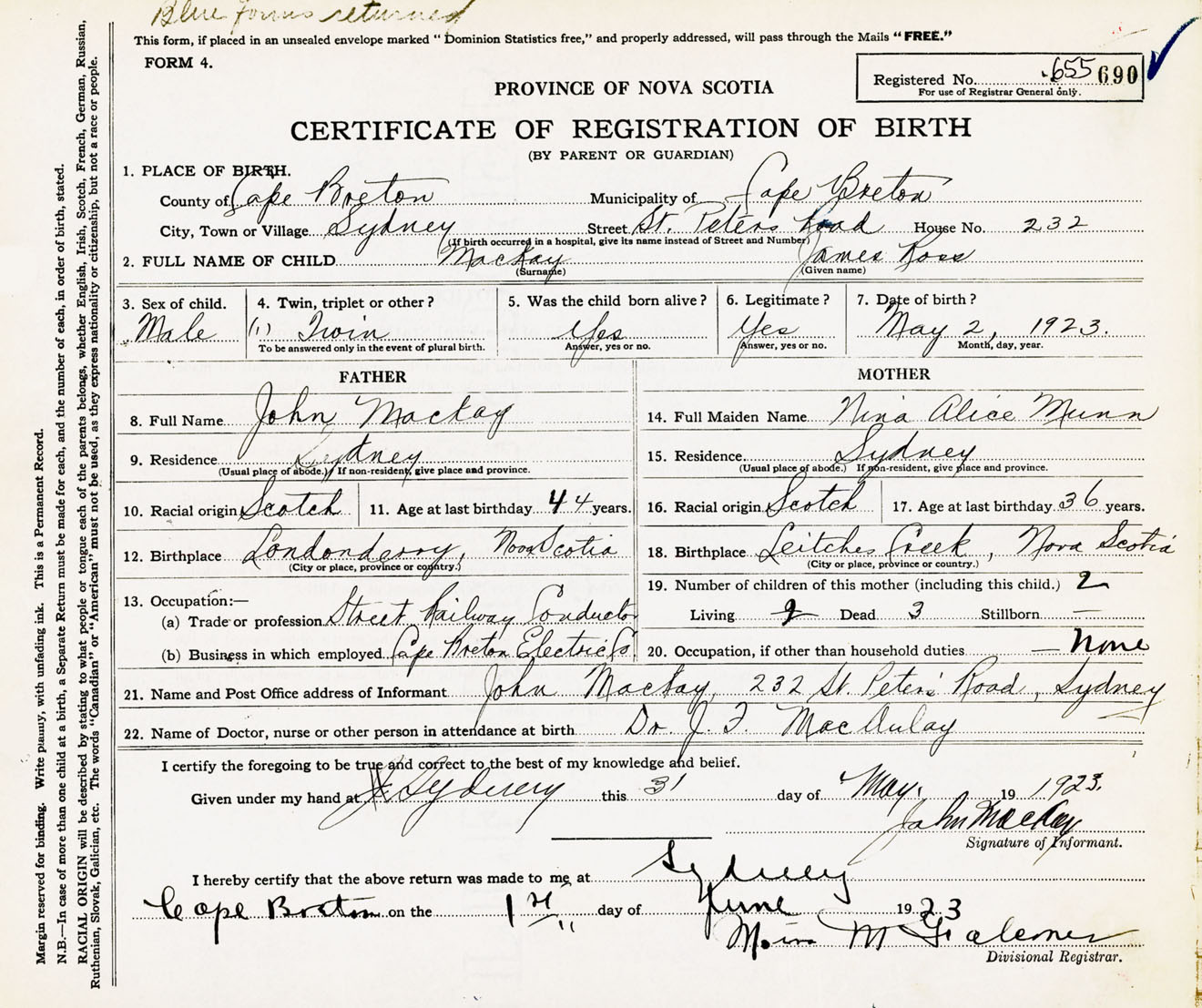 Male Birth Registration: Year: 1923 number: 65500690