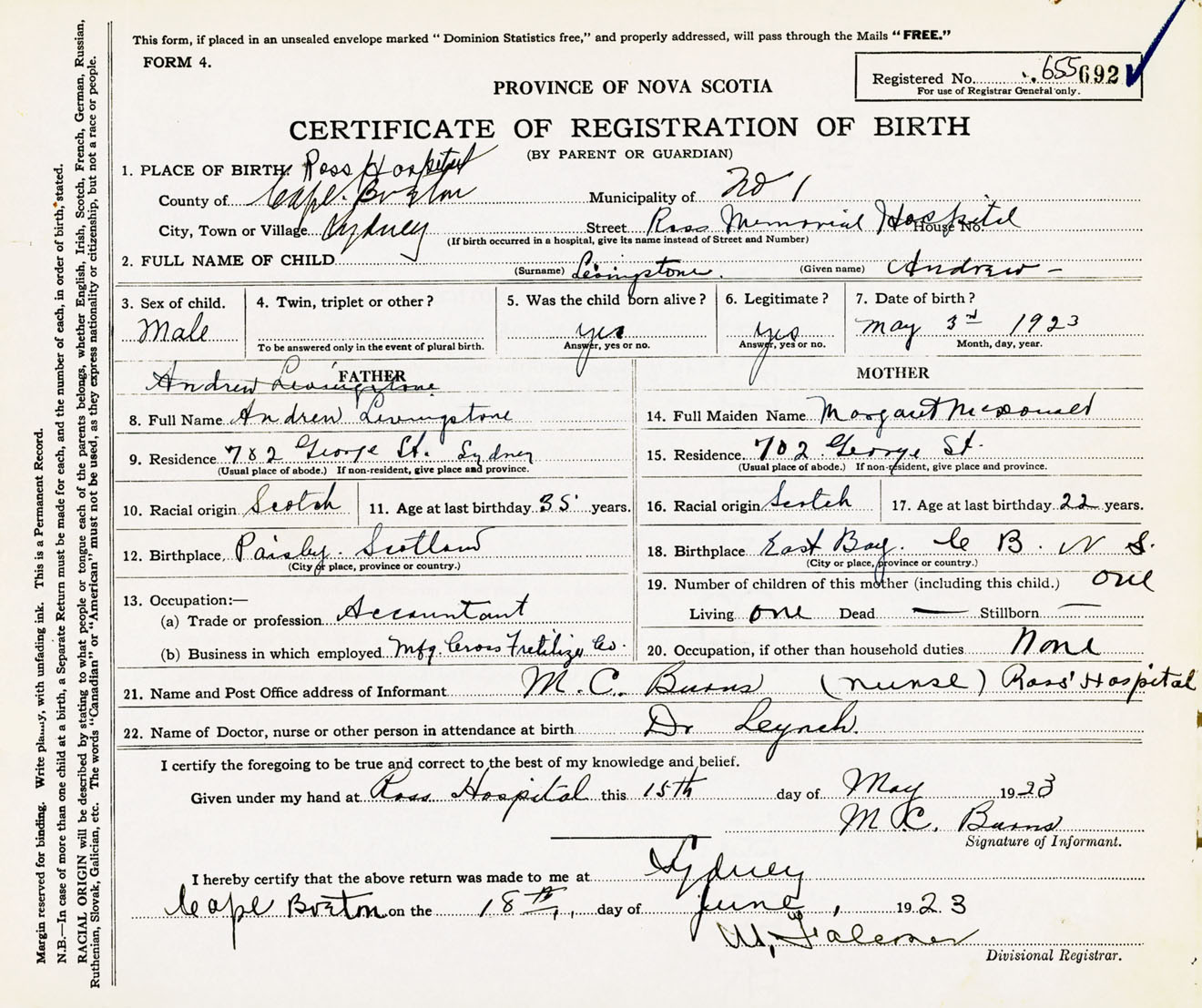 Male Birth Registration: Year: 1923 number: 65500692