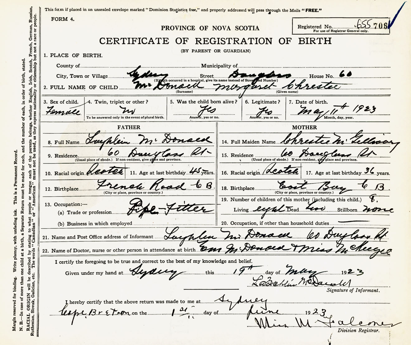 Female Birth Registration: Year: 1923 number: 65500706