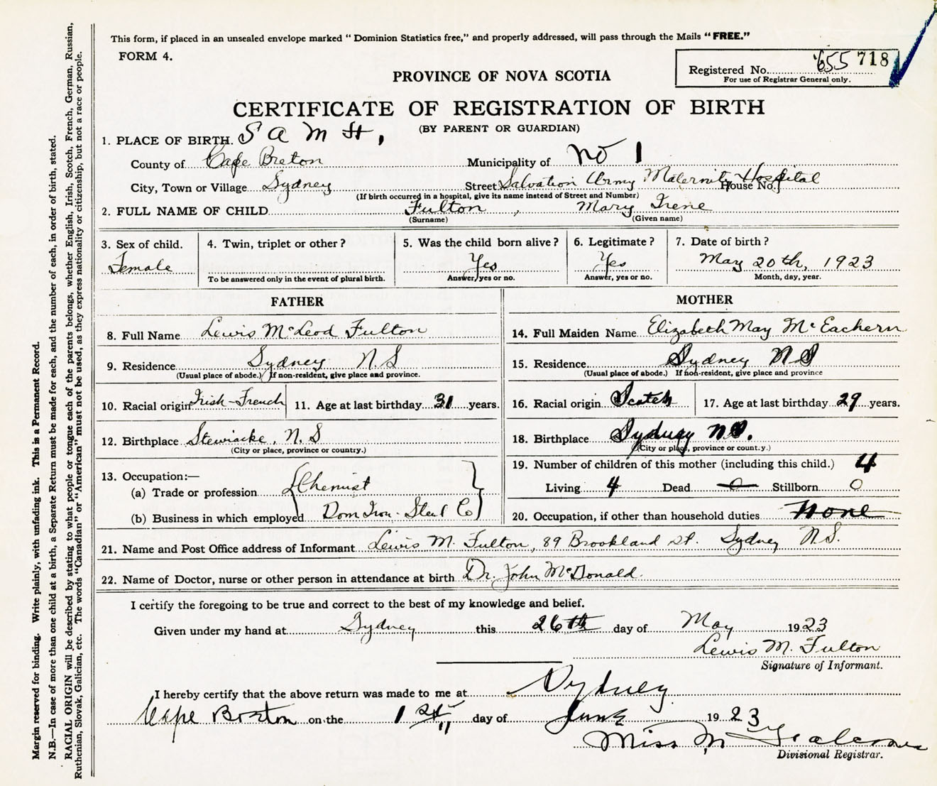 Female Birth Registration: Year: 1923 number: 65500718
