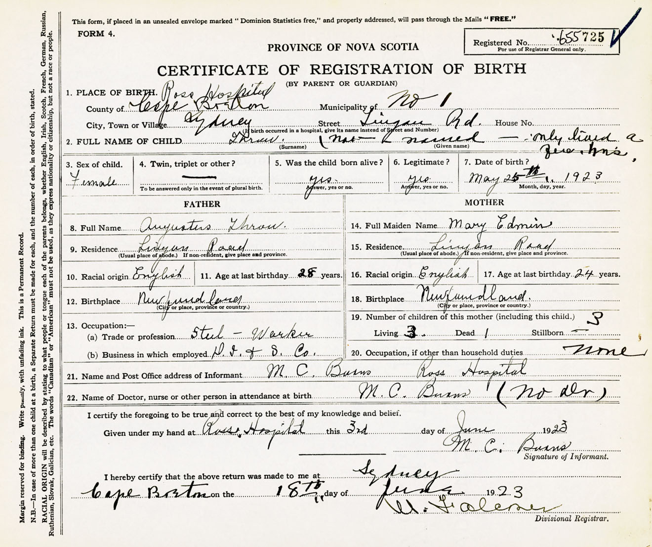Female Birth Registration: Year: 1923 number: 65500725