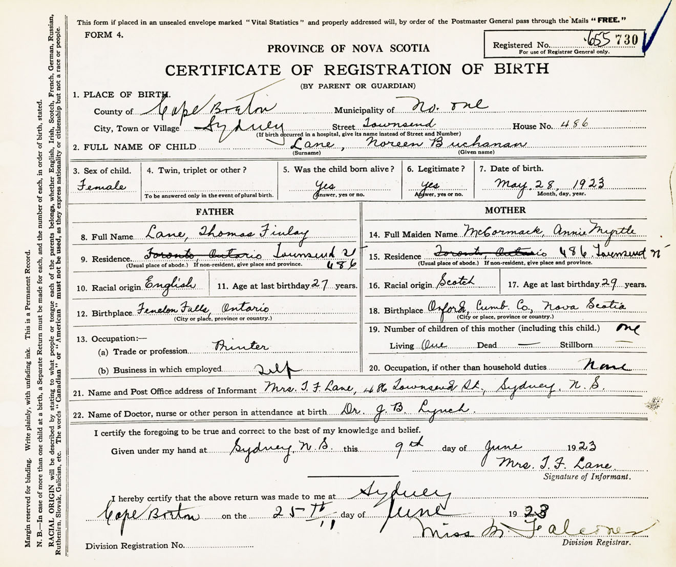 Female Birth Registration: Year: 1923 number: 65500730