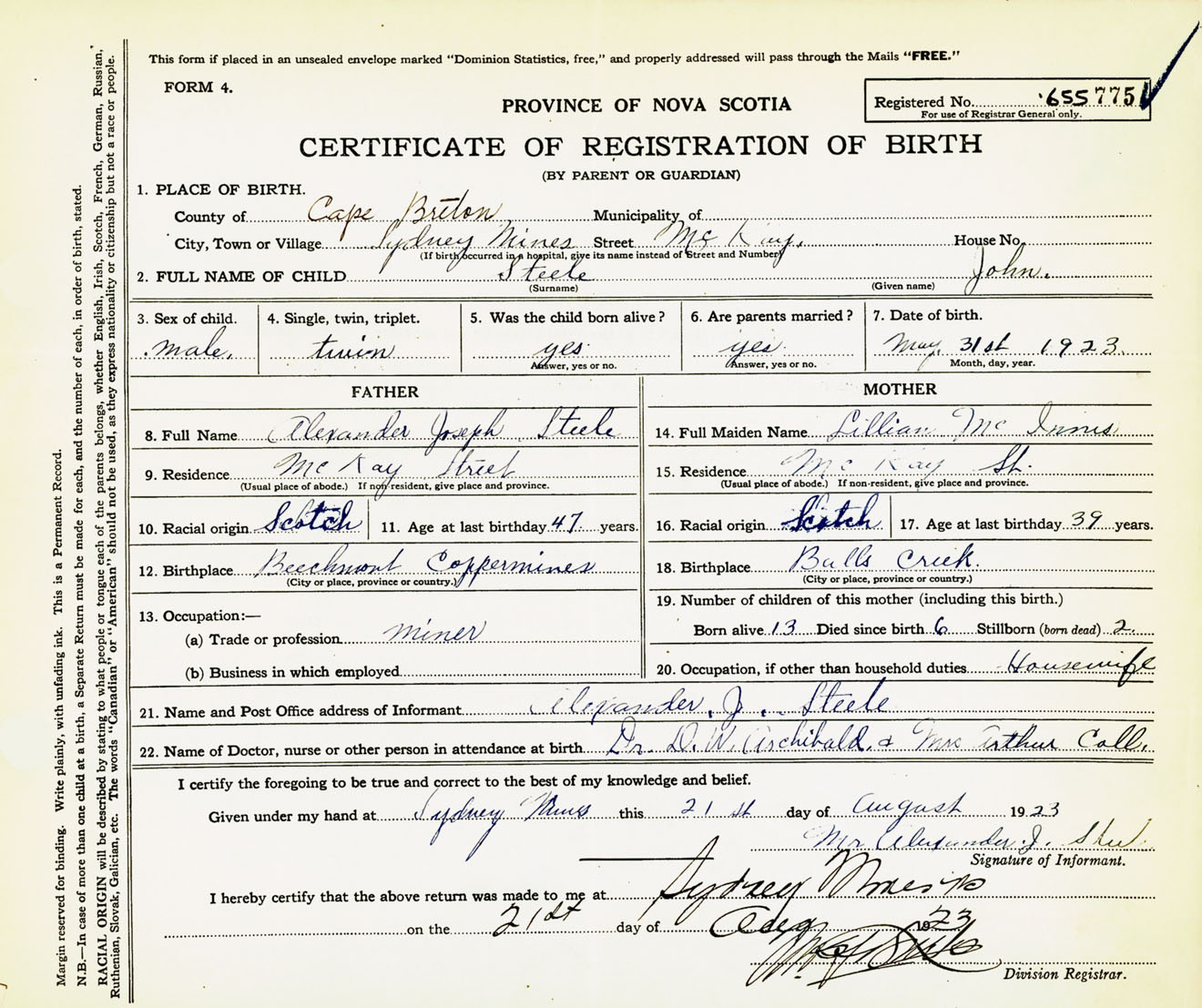 Male Birth Registration: Year: 1923 number: 65500775