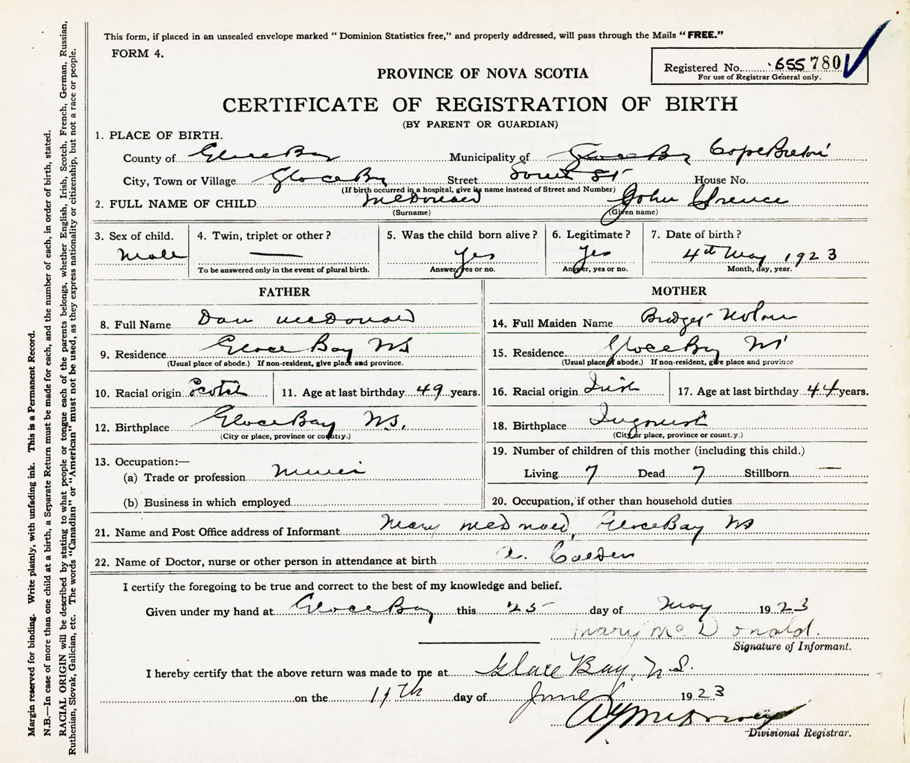 Male Birth Registration: Year: 1923 number: 65500780