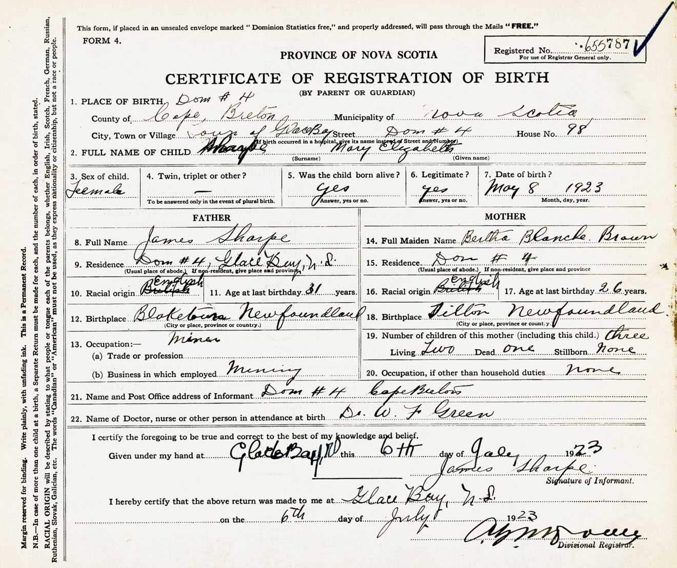 Female Birth Registration: Year: 1923 number: 65500787