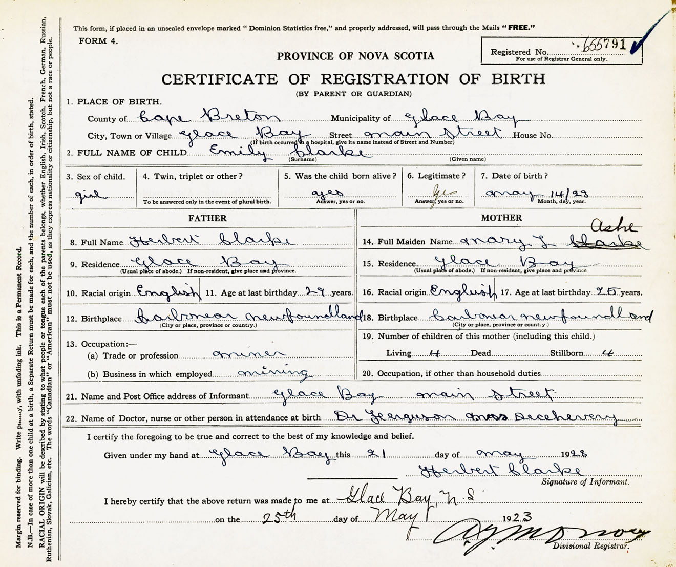 Female Birth Registration: Year: 1923 number: 65500791