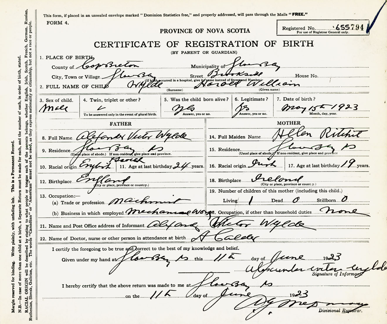 Male Birth Registration: Year: 1923 number: 65500794