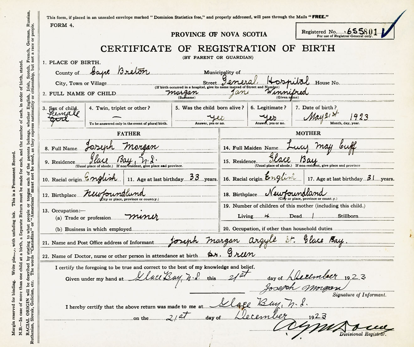 Female Birth Registration: Year: 1923 number: 65500801