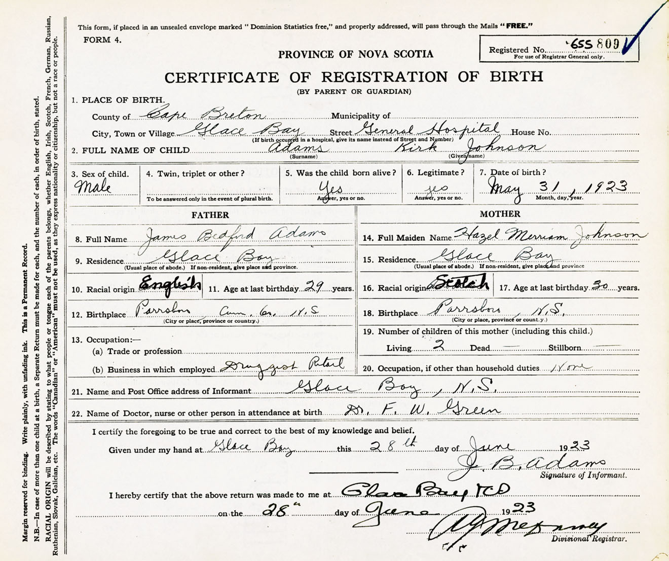 Male Birth Registration: Year: 1923 number: 65500809