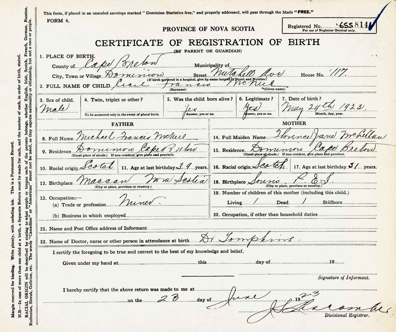 Male Birth Registration: Year: 1923 number: 65500814