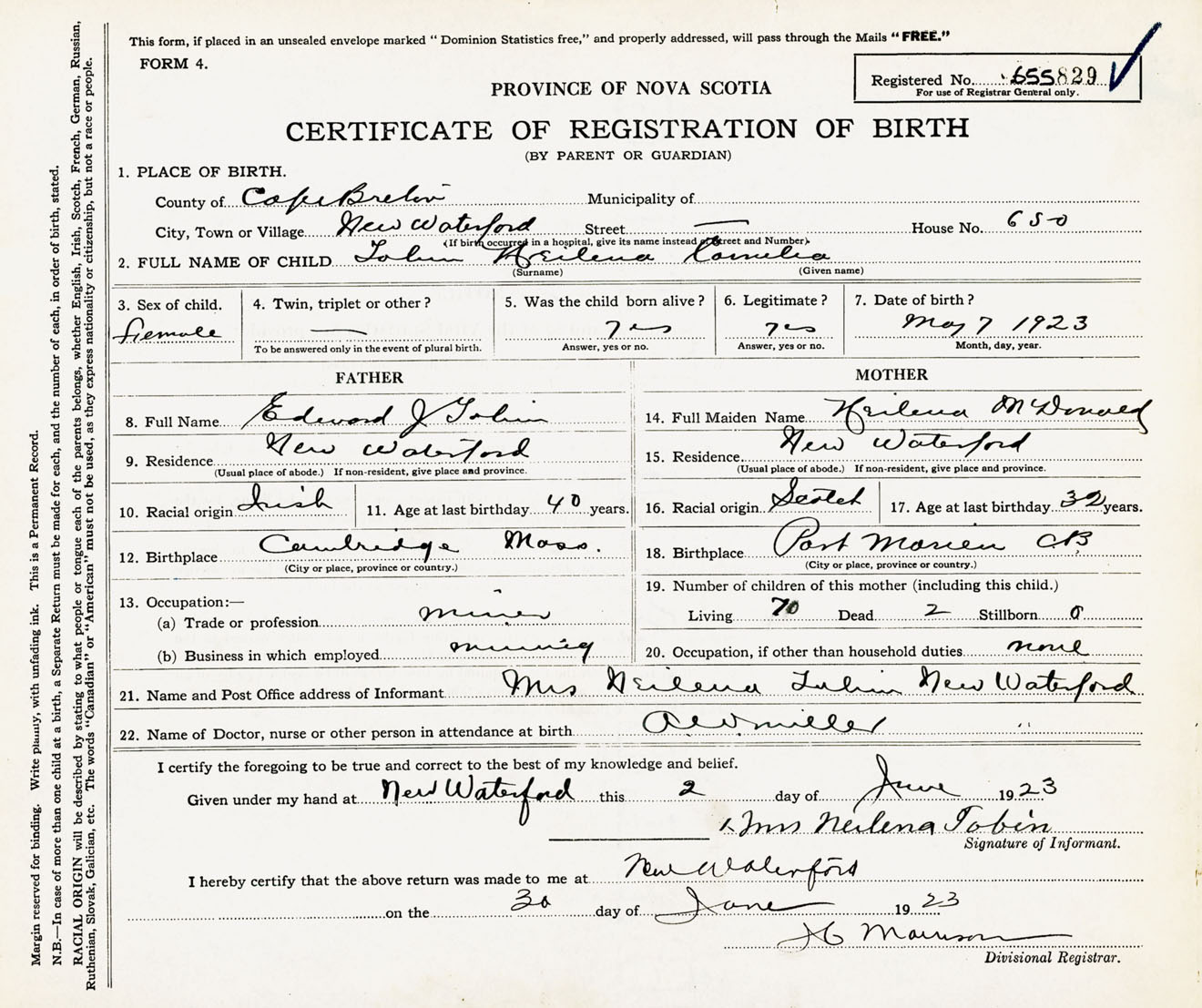 Female Birth Registration: Year: 1923 number: 65500829